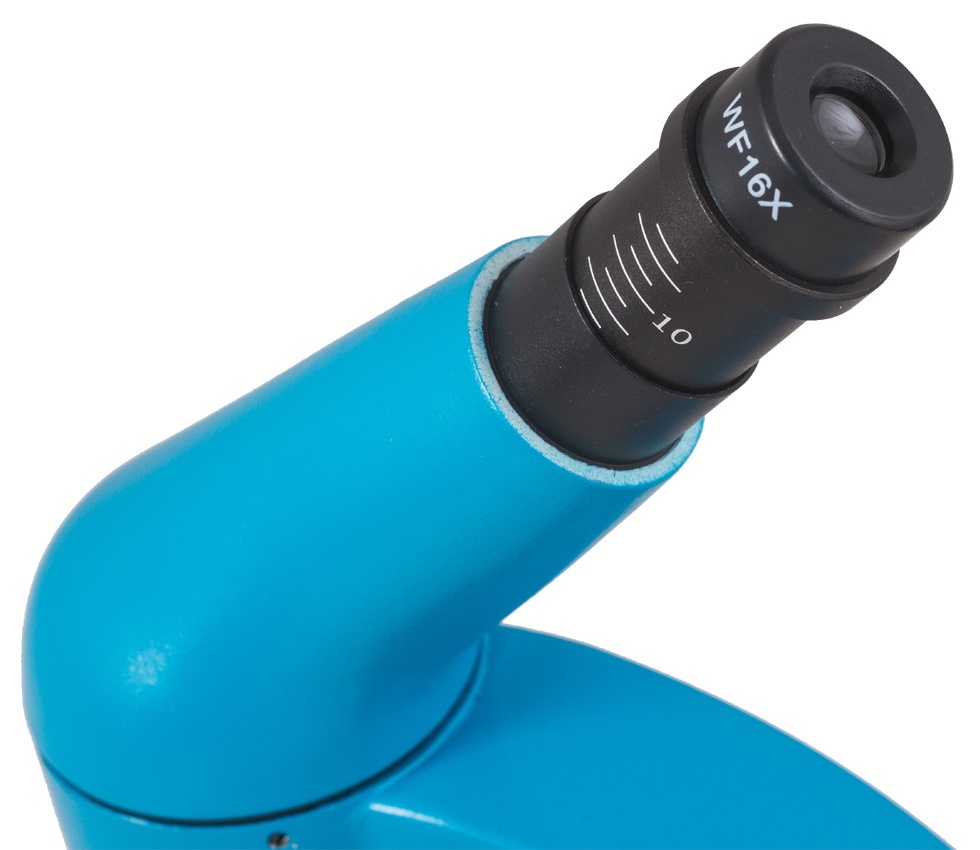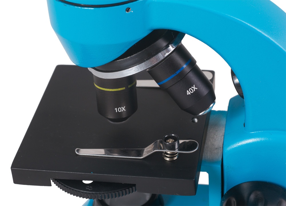 В револьверном устройстве установлены три объектива, с которыми микроскоп дает увеличение в диапазоне от 64 до 640 крат. Объектив с наибольшей кратностью (40xs) снабжен пружинным механизмом. Если исследователь неосторожно заденет объективом покровное стекло, объектив отодвинется, и оптика останется целой. В комплект также входит линза Барлоу — она повышает кратность прибора с каждым объективом в два раза. Таким образом, в микроскоп можно наблюдать препараты при увеличениях 64, 128, 160, 320, 640 и 1280 крат!