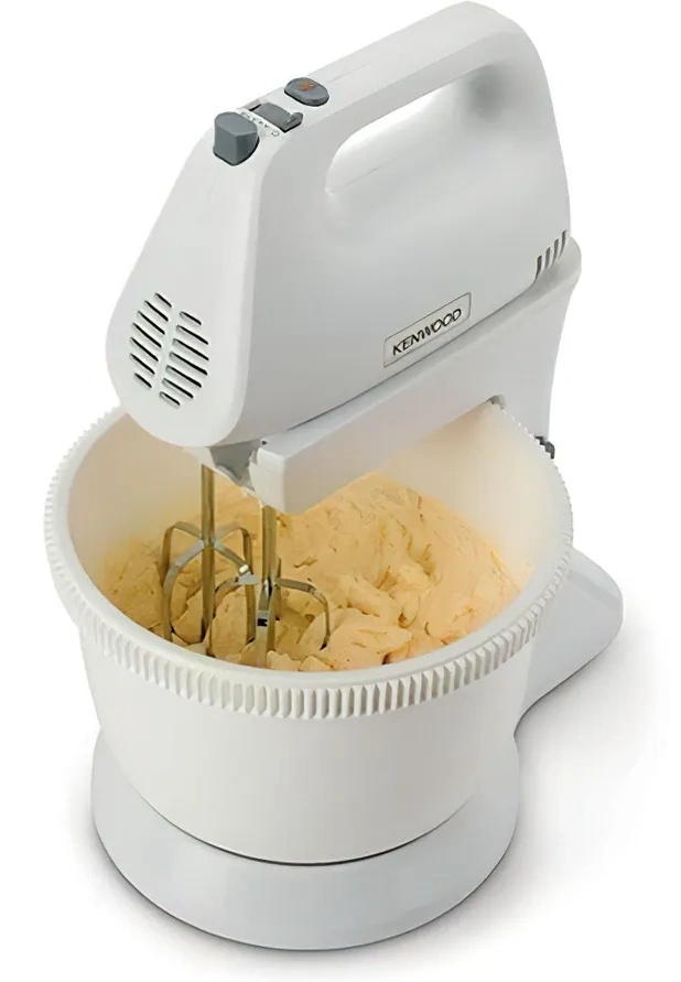 Миксер оснащается парой стандартных металлических венчиков для взбивания, парой крюков для замешивания теста и легкой чашей из белого пластика. Высокие стенки чаши почти исключают разбрызгивание содержимого даже при обработке продуктов в турборежиме. Для быстрой замены насадок, нажмите кнопку в передней части рукоятки. Во время работы насадки надежно фиксируются в пазах и гарантированно остаются на месте при любой скорости вращения.