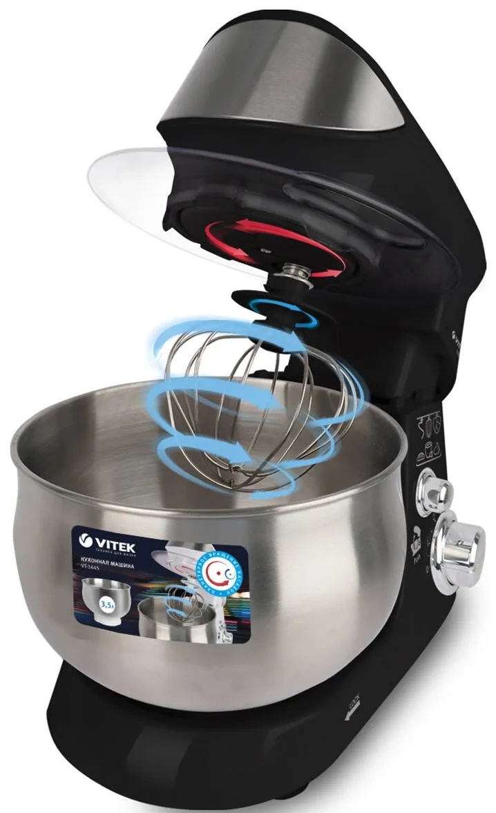 Кухонная машина VITEK с максимальной мощностью 1000 Вт возьмет на себя самую сложную работу по приготовлению блюд. Прибор имеет шесть скоростных режимов, которые можно выбирать по своему усмотрению. В комплект с кухонной машиной входит специальная лопатка, а также три насадки: для взбивания, смешивания ингредиентов и для замешивания теста. Чаша прибора емкостью 3,5 л изготовлена из нержавеющей стали, которая не оказывает влияния на вкус продуктов. Для особого удобства емкость имеет прозрачную крышку с отверстием, которая защищает рабочую поверхность от брызг. Кроме того, через него можно добавлять ингредиенты, не прерывая процесса работы. Одним из главных преимуществ кухонной машины является технология планетарного вращения насадок, благодаря которой они двигаются не только вокруг своей оси, но и по всей поверхности чаши. В результате консистенция крема или теста становится максимально однородной. Желание купить такую кухонную машину возникнет у каждого, кто хочет заниматься кулинарным творчеством. С VITEK жить легко и комфортно!