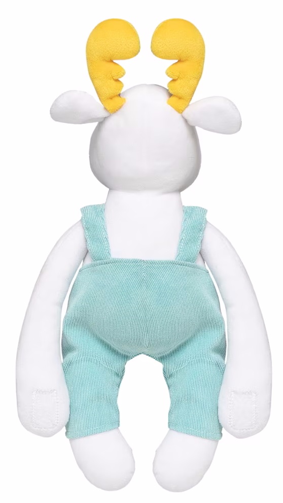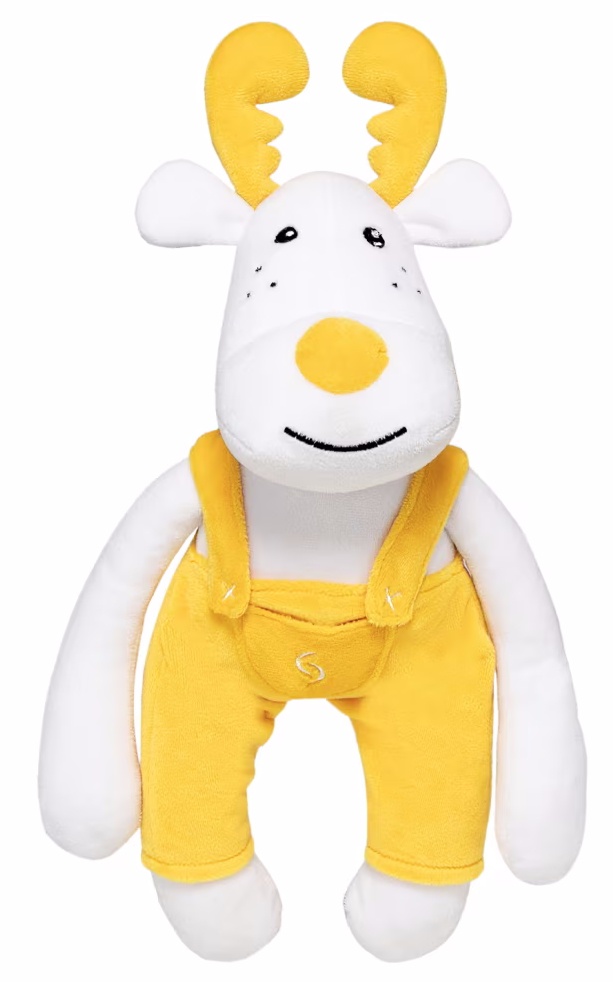 В комплект входит сменный комбинезона. У олененка желтый комбинезон со штанишками и бархатным карманом, а запасной - экстра-бирюзовый. Лапки застегиваются на липучки - игрушку можно повесить куда угодно - на кроватку, тележку и т.д. Он упакован в идеальную коробку, которую можно подарить. Продукт соответствует стандарту EN 71-1/2/3. Подходит с первого дня жизни!
