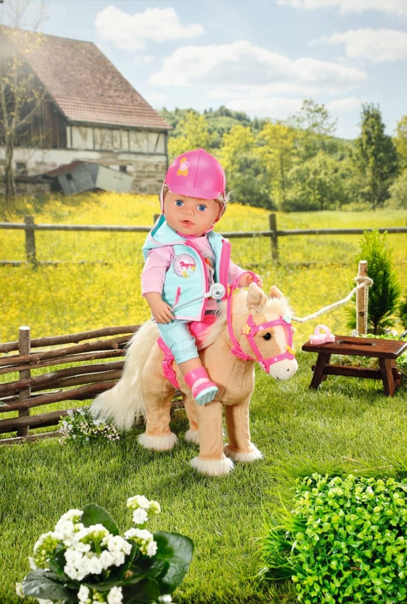 Пришло время для конного соревнования. Baby Born всегда прилагает дополнительные усилия, чтобы ее милый пони выглядел красиво. Розовое седло и уздечка украшены яркими булавками, а белая грива и хвост тщательно стилизованы.