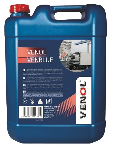 VENOL VENBLUE – нетоксичный раствор мочевины, применяемый для химического снижения оксида азота (NOx) в транспортных средствах с дизельным двигателем, оснащенных технологией SCR. Соответствует требованиям нормы DIN V 70070, а также регулированию ISO и CEFIC, что гарантирует безопасное и безаварийное функционирование системы SCR в транспортных средствах. Соответствует нормам Евро VI, установленным Евросоюзом для транспортных средств, дающим возможность контроля выбрасываемых ими выхлопных газов, в особенности: оксида азота (NOx), твёрдых частиц (РМ), углеводорода (НС), а также окиси углерода (CO). Из-за сильного коррозийные свойства избегать утечек на кузов автомобиля.