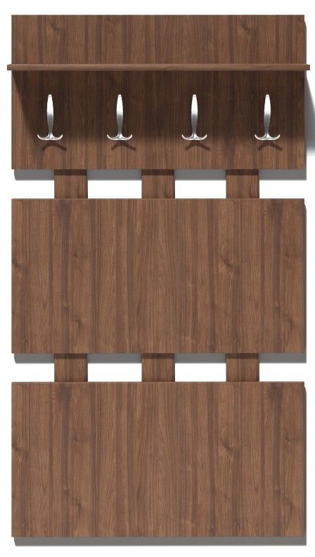 Навесная вешалка позволит разместить сезонную одежду всей семьи. Она состоит из 3-х панелей соединенных вертикальными рейками. Полка, закрепленная над крючками для одежды, предназначена специально для головных уборов и зонтов. Максимальная нагрузка на полку составляет 5 кг. Она может быть самостоятельным элементом, а может использоваться в ансамбле с обувницей из системы.