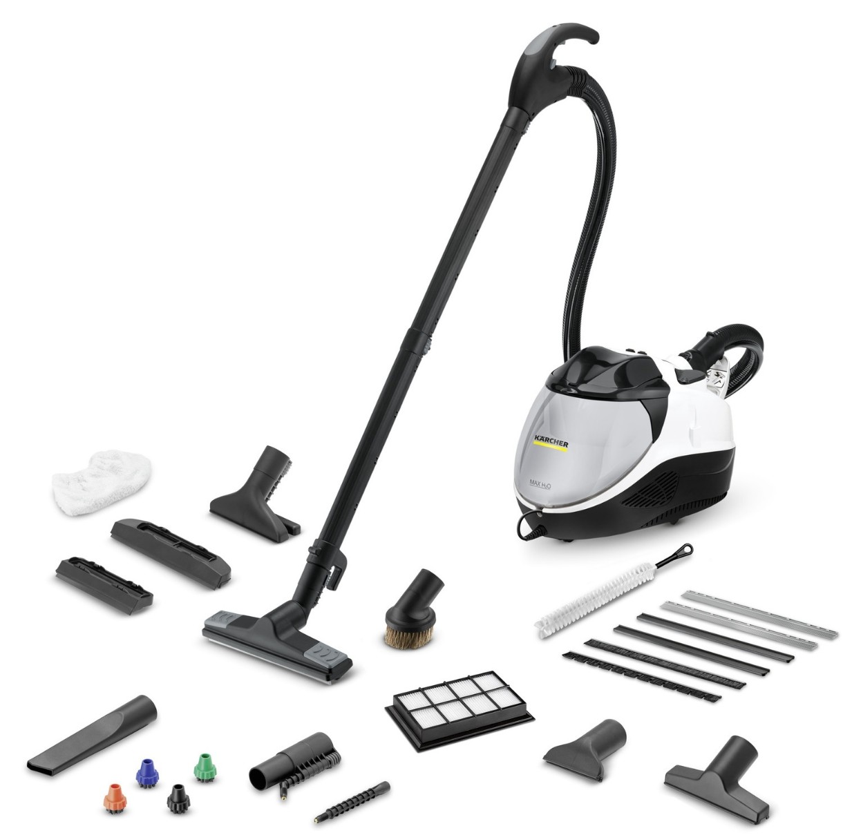 ручная насадка (для паровой обработки), точечное паровое сопло, щелевая насадка, насадки для окон (большая и малая), насадка для мягкой мебели, щеточная насадка для мебели