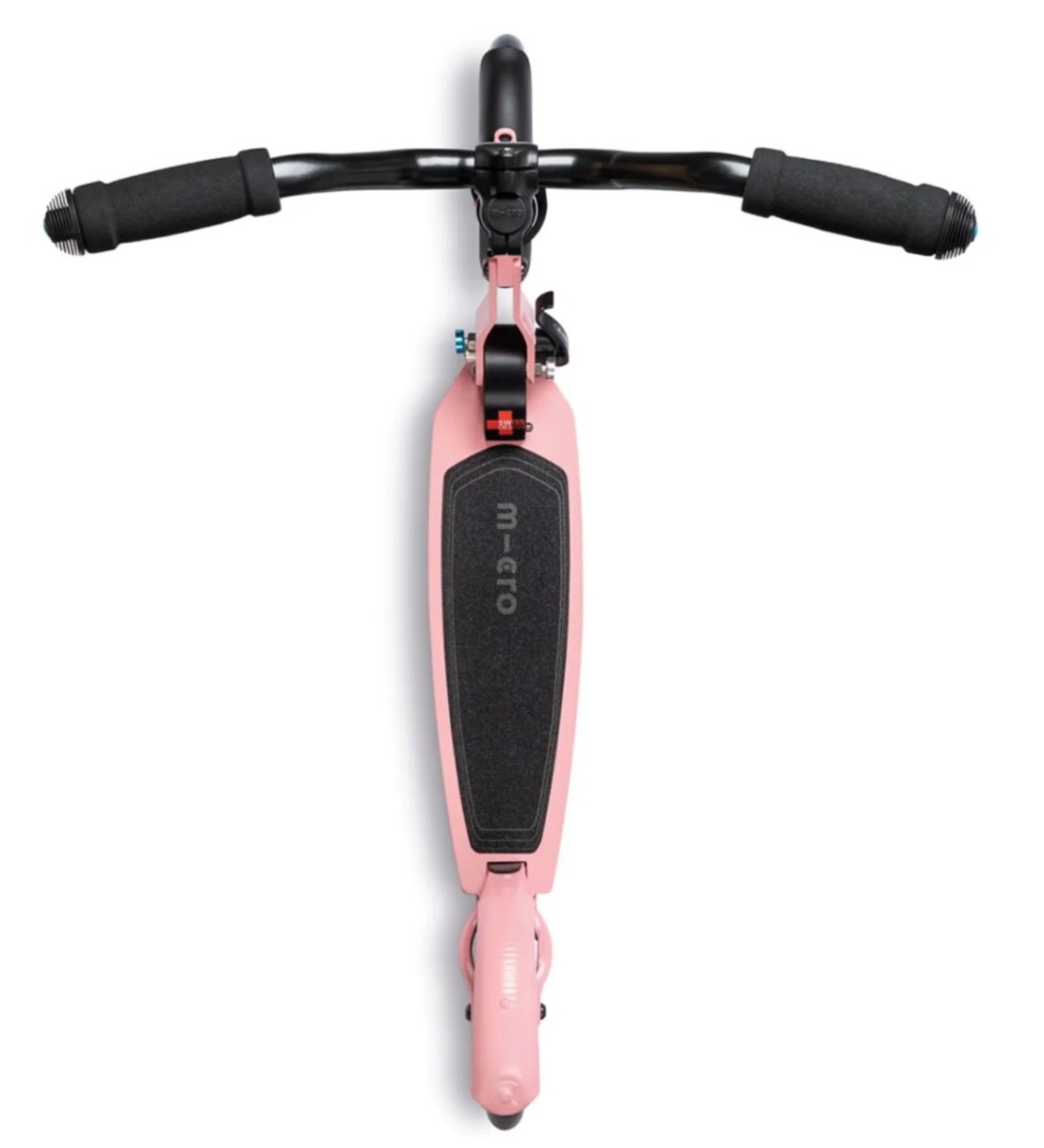 Micro Speed Deluxe имеет колеса диаметром 180 мм, которые обеспечивают комфортную езду. Переднее колесо имеет брызговики, такую же роль выполняет задний тормоз. Руль выполнен в стиле ретро для лучшего баланса пользователя. Гораздо легче сохранять равновесие на самокате, если держать руки врозь. Также повороты проходят легче и без потери устойчивости. Руль регулируется в диапазоне от 780 до 1030 мм.