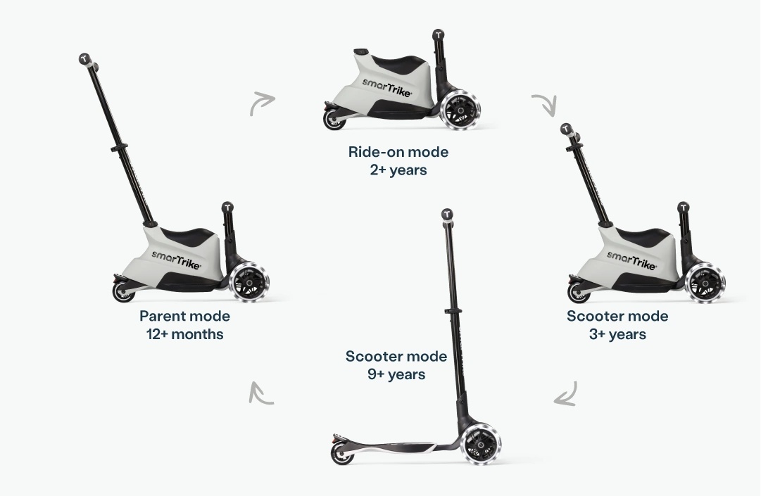 Он начинается с родительского самоката (от 12 месяцев), затем переходит в самокат с ножным приводом (от 2 лет), затем в самокат (от 3 лет) и расширяется для детей до 12 лет. Благодаря инновационной выдвижной подножке, очень большим колесам для устойчивости и быстроскладывающейся конструкции этот самокат «4 в 1» легко адаптируется к любому возрасту ребенка.