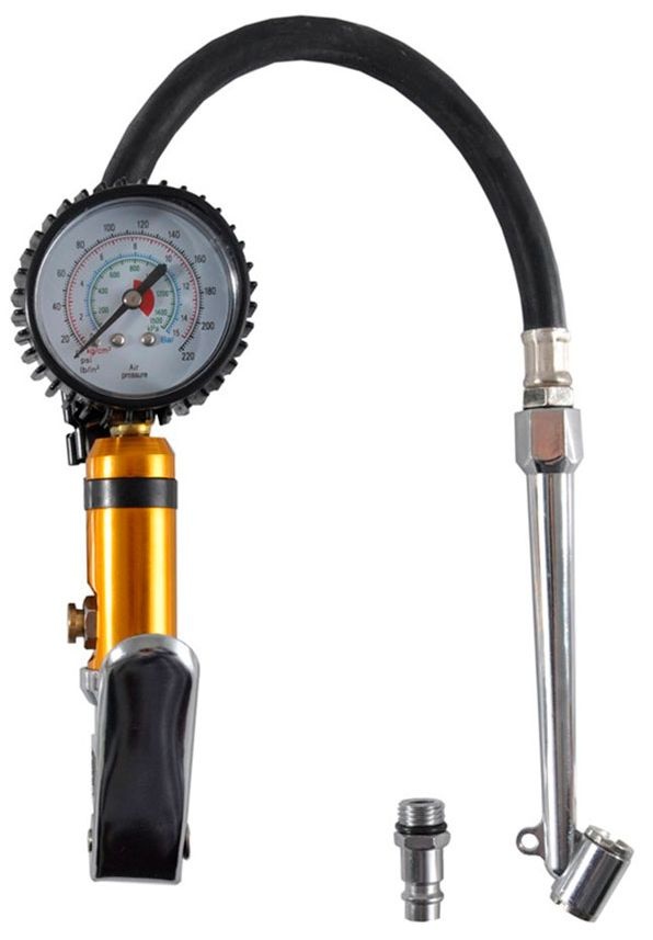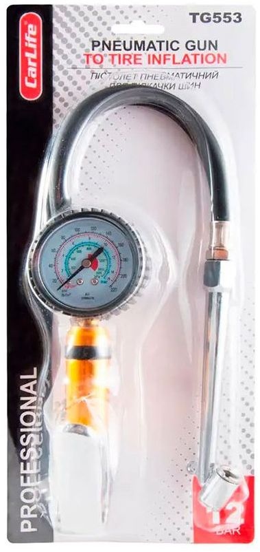 Манометр CarLife TG553 — необходимая вещь для подкачки, контроля и стравливания внутреннего давления в шинах. Пистолет TG553 имеет встроенный манометр и циферблат. Максимальное рабочее давление не должно превышать 12кгс/см2(12Bar). Поверхность манометра изготовлена из противоударного пластика, для защиты от механических повреждений. Корпус выполнен из стали, высокого качества, что обеспечит длительный срок службы. Эргономическая ручка удобной формы. В комплекте прочный резиновый шланг высокого давления, длиной 450мм, что вполне достаточно для присоединения к ниппелю в любом положении колеса. На конце шланга расположен удлиненный наконечник со специальным фиксатором, что позволит облегчить доступ к ниппелю в сдвоенных колесах грузовых автомобилей. За счет быстросъемного соединителя, размер входного отверстия 1/4" дюйма, можно быстро и легко присоединится к источнику подачи сжатого воздуха.