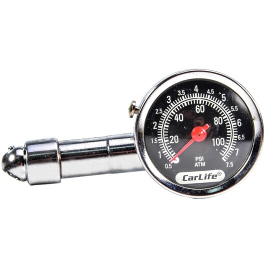 Автомобильный манометр CarLife используется для проверки давления в шинах автомобиля. Имеет металлический корпус с резиновым покрытием и кнопку сброса давления. Давление 0,5-7.5 Атм (20-100 PSI)