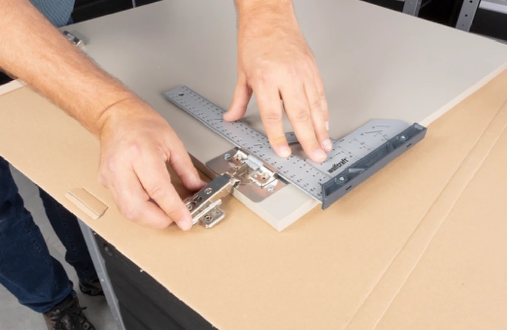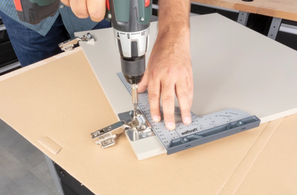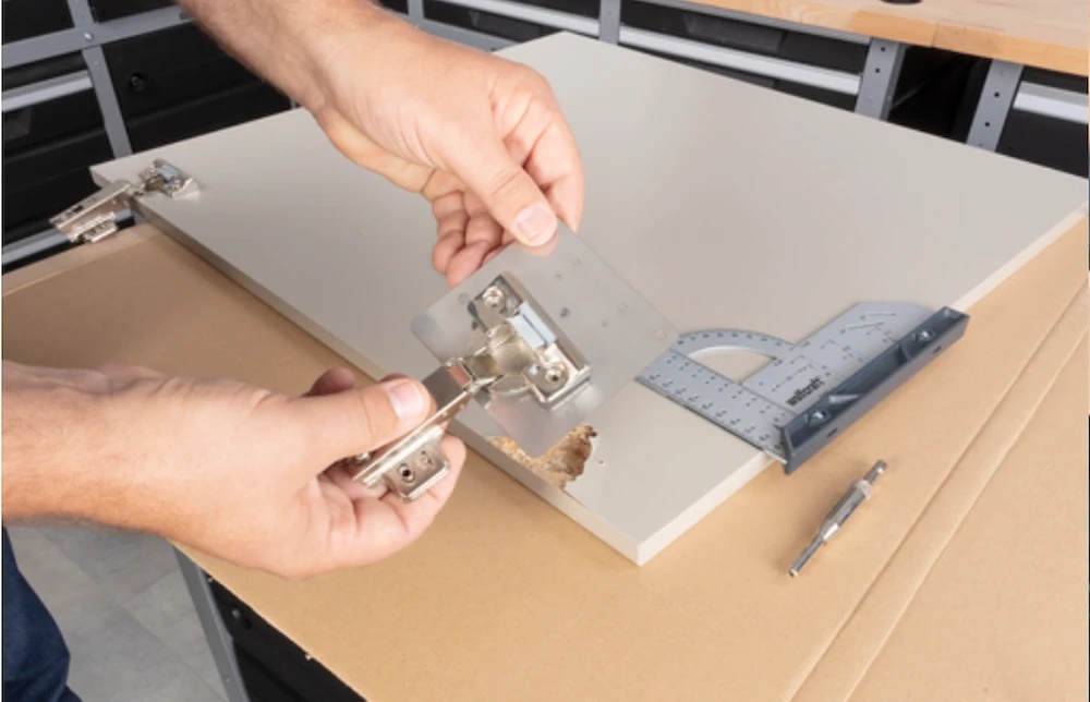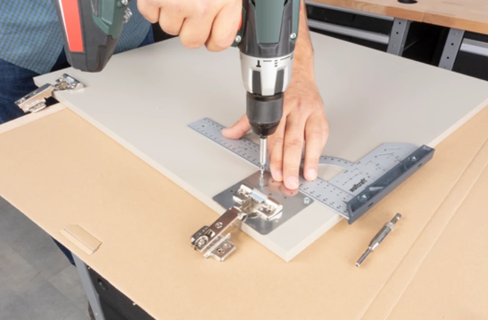 2 монтажные панели 9 x 9 см, 14 винтов с потайной головкой, 1 самоцентрирующее сверло для петель