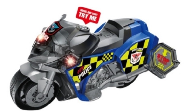 В игрушку включены звуковые и световые эффекты, которые делают игру интереснее. Он имеет современный и привлекательный дизайн, сине-белый цвет, типичный для полицейских мотоциклов.