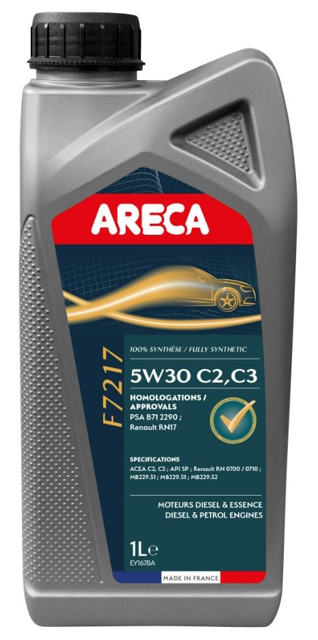 Высококачественное синтетическое моторное масло, обеспечивающее защиту от износа, долговечность систем нейтрализации отработавших газов (технология «Low-SAPS») и экономию топлива. Это ограничивает риски LSPI (Low Speed Pre-Ignition), тем самым продлевая срок службы двигателей. ARECA F7217 специально разработано для бензиновых (кроме Puretech) или дизельных (кроме Blue HDi) двигателей Peugeot, Citroën или DS, для которых требуется спецификация PSA B71 2290. Он также посвящен текущие двигатели Renault, требующие стандарта RN17. Этот продукт подойдет там, где рекомендуется уровень ACEA C2 или C3. Это масло не подходит для двигателей RS или Alpine (стандарт RN17 RSA) или когда требуется спецификация RN0720.