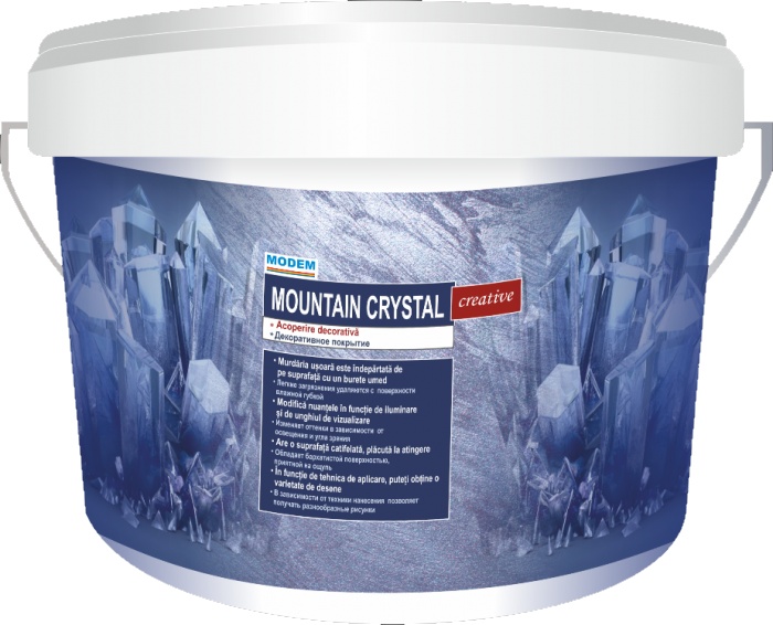 MOUNTAIN CRYSTAL — это ультра-искрящееся и ультра-трендовое перламутровое декоративное покрытие. Основным отличием от декоративного покрытия MOUNTAIN CRYSTAL является наличие в составе мелких стеклянных частиц, которые создают неповторимое сияние и перелив на поверхности. Оригинальность и неповторимость этого материала заключается в том, что фактура поверхности визуально меняется в зависимости от направления света.