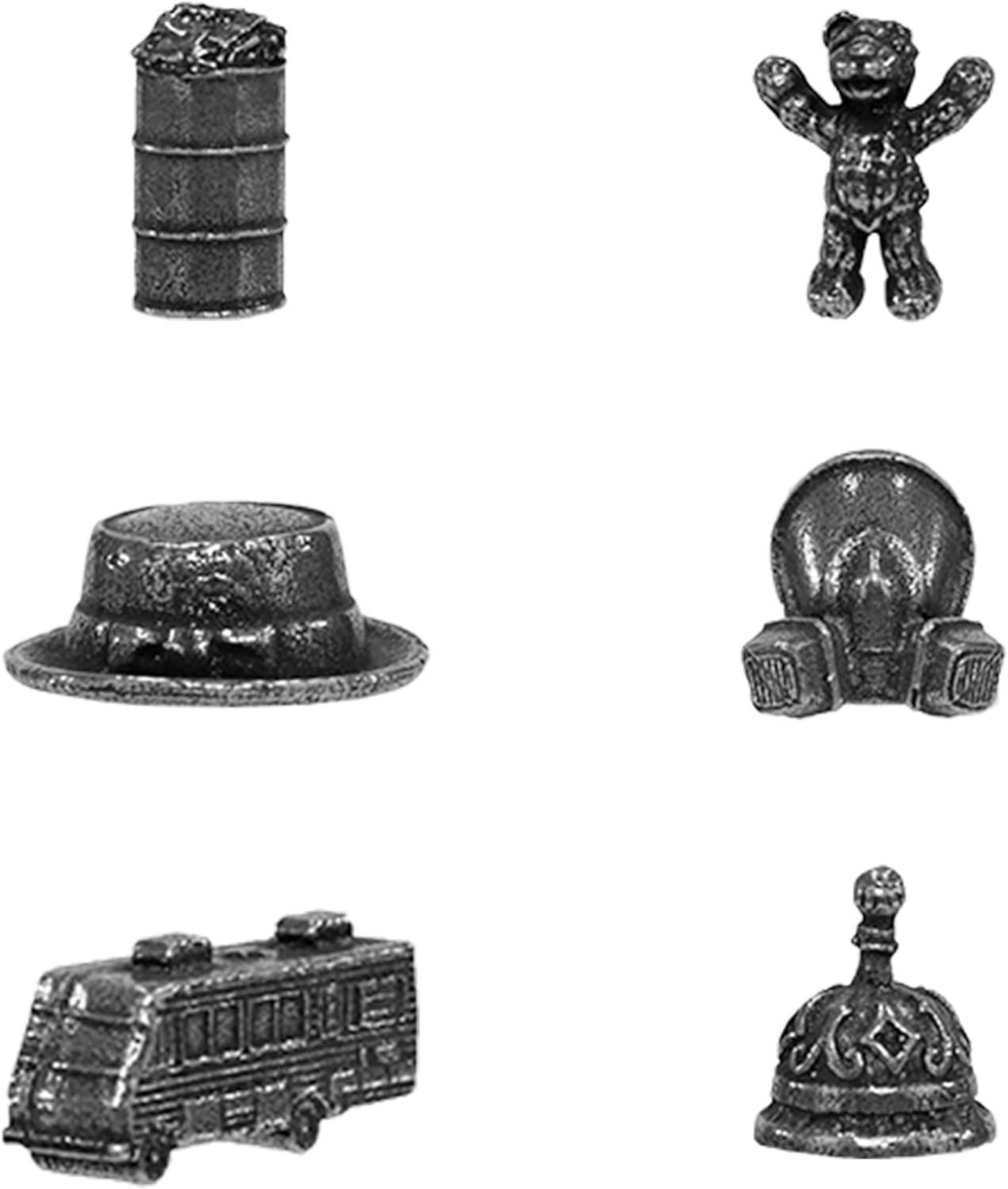 6 уникальных фишек: шляпа Хайзенберга, звонок Тио, бочка с деньгами, противогаз, розовый мишка, фургон