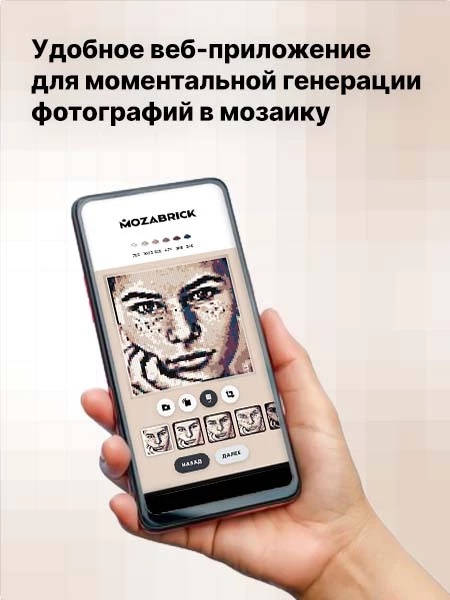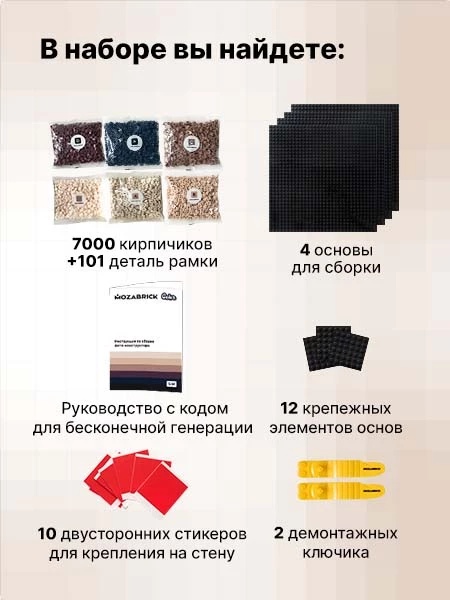 Перед вами яркая новинка этого года – Mozabrick Color. Собирайте любые фотографии из конструктора по нашей простой инструкции. Идеально подобранные цвета кубиков, продуманная до мелочей комплектация набора и оптимальный размер картины сделают абсолютно любую вашу фотографию крутым пиксель-артом, а более 7000 кубиков позволят создать портрет с лучшей детализацией, чем когда-либо! Mozabrick Color предлагает вам 6 цветов кирпичиков +1 дополнительный цвет за счет черной основы. Главная фишка этого набора в том, что теперь можно создавать объемные картины. А что собирать – решаете вы! Готовая картина впишется в любой интерьер благодаря универсальным цветам набора. Всего 3 простых шага: