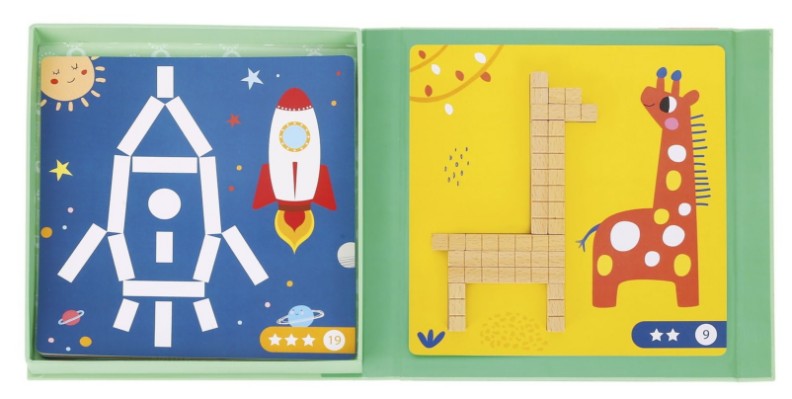 Веселая игра с деревянными палочками, которые дети размещают на карточке, чтобы воссоздать фигуры и картинки. В набор входят 12 листов с двусторонней печатью и 36 магнитных палочек (разной длины), которые могут использовать дети. Магнитная коробка и палочки помогут удерживать картинку на месте. Это побуждает исследовать концепцию длины через игру.