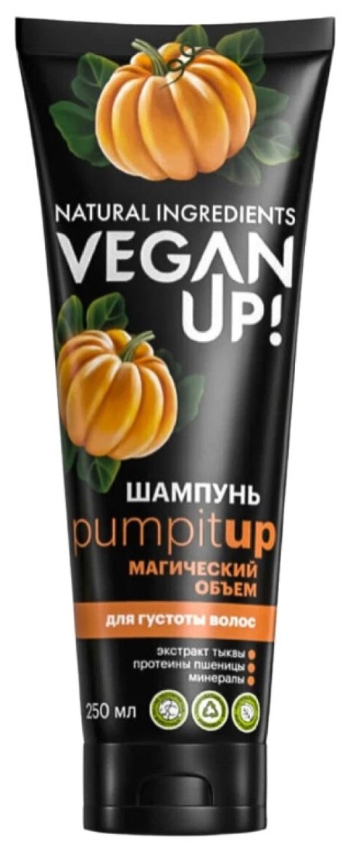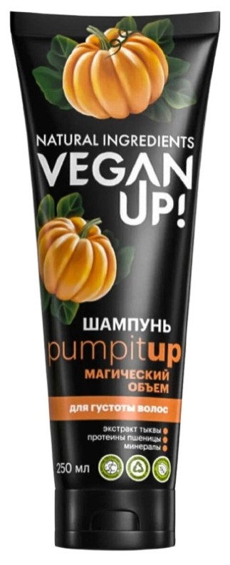 Веганский шампунь «Магический объем. PUMPITUP» на основе экстракта тыквы и протеинов пшеницы бережно и глубоко очищает кожу головы и волосы, придает густоту и свежесть, создает заметный прикорневой объем.