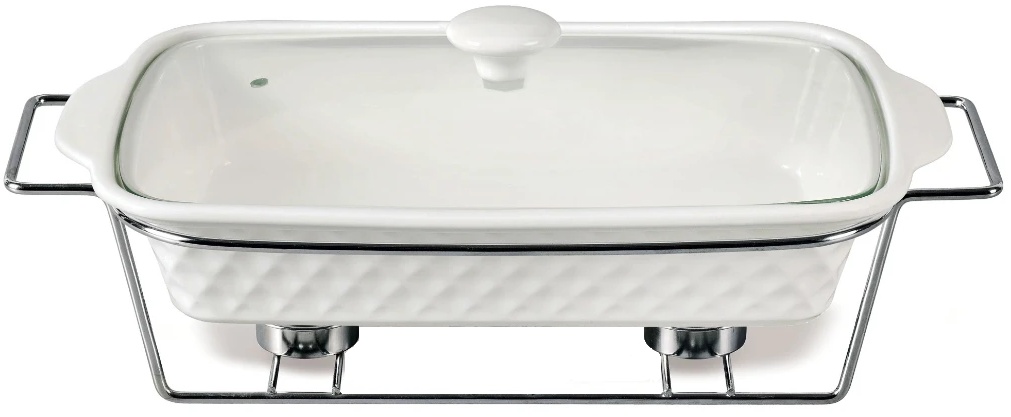 Мармит имеет прямоугольную форму, изготовлен из высококачественной керамики, подставка металлическая, крышка из жаростойкого стекла.