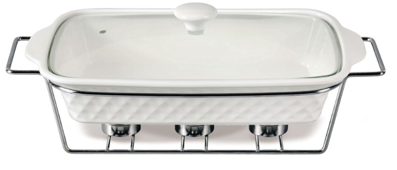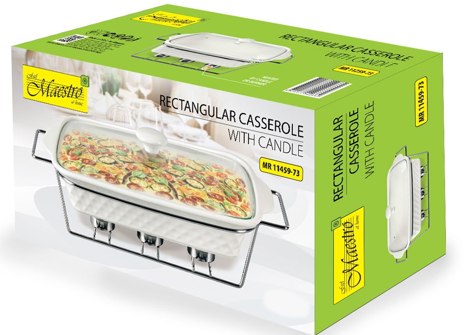 Мармит Maestro MR-11459-73 объемом 1,8 л предназначен для подачи горячих блюд на стол, подогрева пищи, поддержки пищи теплой после приготовления. Мармит имеет прямоугольную форму, ихготовлен из высококачественной керамики, подставка металлическая, крышка из жаростойкого стекла. Благодаря греющей горелке – свече, что расположена в нижней части на специальной подставке, мармит удобно использовать на открытом воздухе, где нет доступа к источникам тепла.
