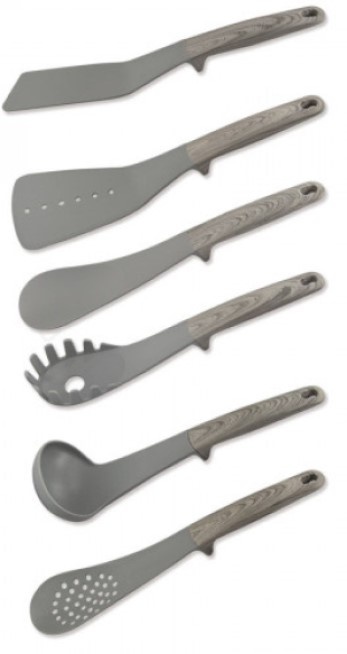 Maestro MR 1547 — недорогой современный набор столовых принадлежностей, состящий из 6 предметов и держателя: лопатки, картофелемялки, ложки для спагетти, половника, шумовки, поварской ложки. Набор подходит для повседневного использования.