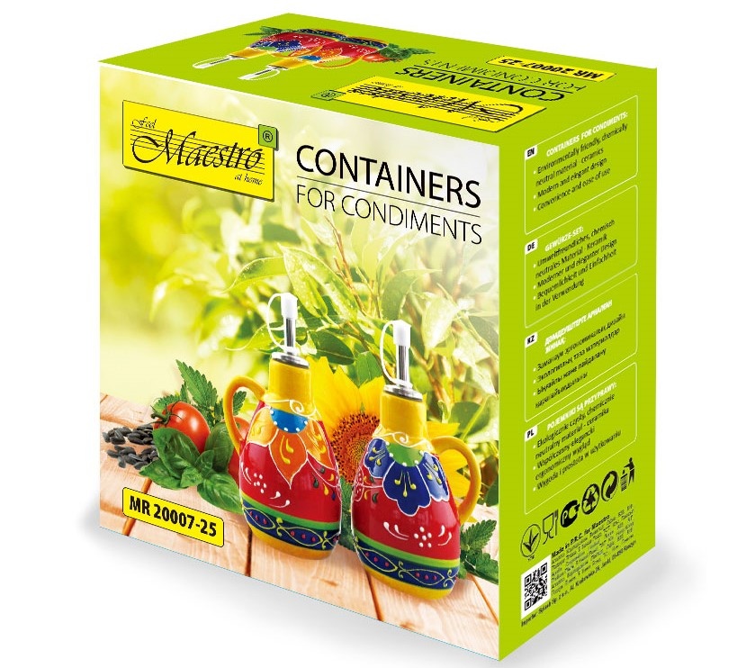 Maestro MR 20007–25 это набор из двух керамических ёмкостей предназначенных для хранения растительного масла и уксуса. Предметы изготовлены из экологически чистой керамики с ярким рисунком.