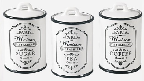 Maestro MR 20030-03CS набор из трех керамических ёмкостей с крышками для сахара, кофе и чая. Черная надпись Paris Maison, sugar, tea, coffe на белом корпусе.