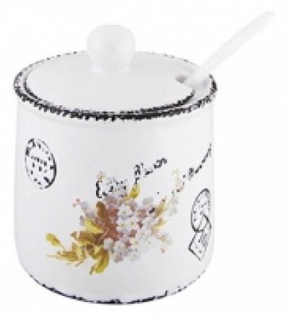 Сахарница Maestro MR 20049-09 изготовлена из керамики белого цвета, в комплект входят емкость для сахара, керамическая ложка и керамическая крышка с отверстием для ложки. На передней части изображен цветок незабудки.