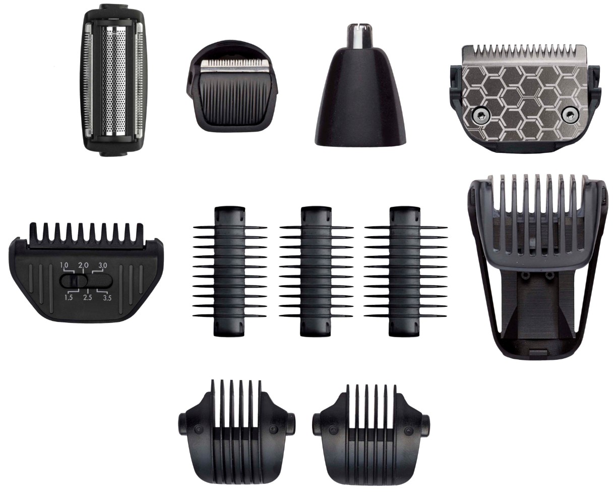 Комплектациятриммер, комплект насадок для стрижки 6 шт, насадка для носа и ушей, насадка для тела, бритвенная насадка, точечная насадка, сумочка для хранения, щеточка для чистки, масло для смазки