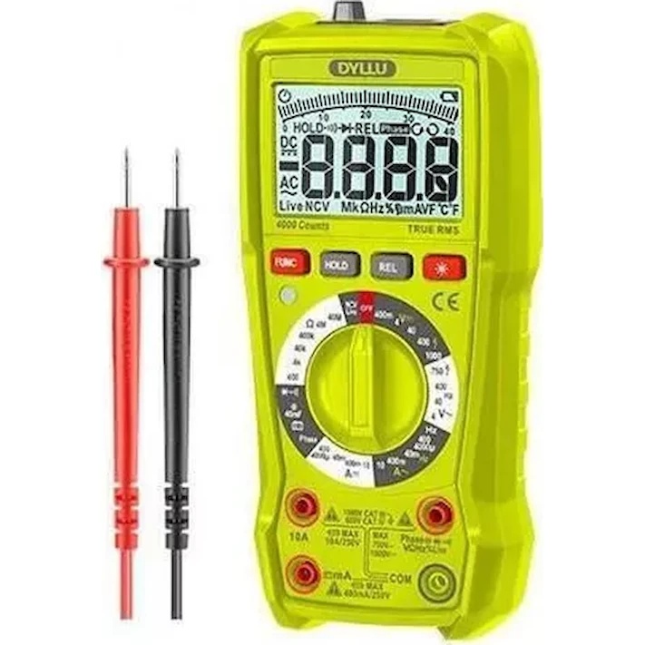 Dyllu DTDM2502 — это цифровой мультиметр, предназначенный для измерения различных электрических величин, таких как напряжение, ток и сопротивление. Он оснащен интеллектуальными функциями, включая True RMS и бесконтактное определение напряжения.
