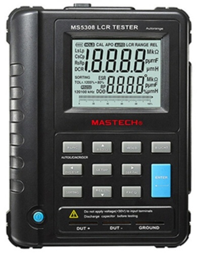 MS5308 высокоточный мостовой измеритель LCR MASTECH — радиоизмерительный прибор, предназначенный для определения параметров полного сопротивления или полной проводимости электрической цепи. Название прибора складывается из измеряемых прибором величин: R — Сопротивление, С — Емкость, L — Индуктивность.