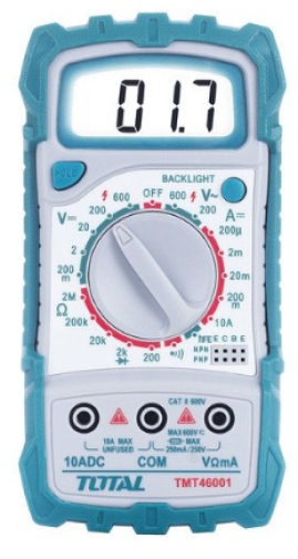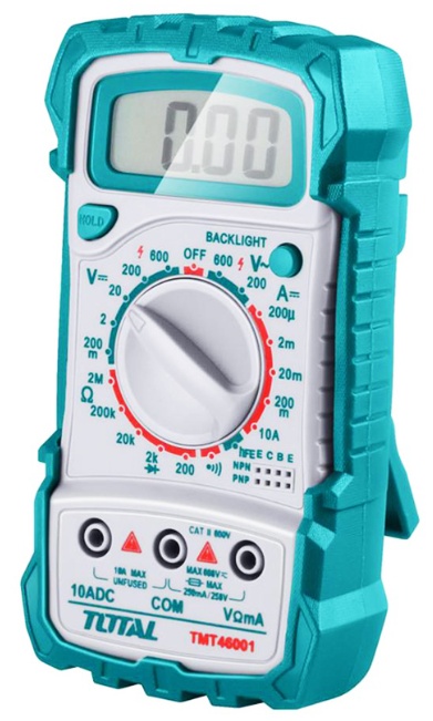 Мультиметр цифровой 20W TMT46001 — это универсальный прибор, позволяющий замерять показатели напряжения, сопротивления и силы тока в проводниках, а также проверять кабели на обрыв. Результаты измерений отображаются в цифровом виде на ЖК-экране, что значительно удобнее и понятнее, чем шкала аналогового мультиметра. Дисплей данного прибора обладает подсветкой и может отображать до 1999 знаков. Простой и удобный переключатель позволяет выставить такие значения измерений: для напряжения постоянного тока 200mВ/2В/20В/200В/600В, напряжения переменного тока: 200В/600В, силы постоянного тока: 200μA/2mA/20mA/200mA/10A, сопротивления: 200Ω/2kΩ/20kΩ/200kΩ/2MΩ.