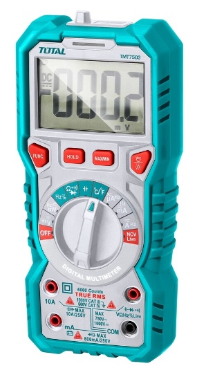 Цифровой мультиметр TOTAL TMT47502 — это универсальный прибор, позволяющий контактно и бесконтактно замерять показатели напряжения, частоты, сопротивления, ёмкости и силы тока в проводниках, а также проверять кабели на обрыв Кроме того, данный прибор позволяет осуществлять диодный тест и тестирование HFE, а также определять фазу и ноль в сети Результаты измерений отображаются в цифровом виде на ЖК-экране, что значительно удобнее и понятнее, чем шкала аналогового мультиметра Дисплей данного прибора обладает подсветкой и может отображать до 6000 знаков Также данный мультиметр оснащён фонариком и индикатором заряда аккумулятора Напряжение постоянного тока: 600 мВ / 6 В / 60 В / 600 В / 1000 В ± (0,5% +3) Напряжение переменного тока: 600 мВ / 6 В / 60 В / 600 В / 750 В ± (0,8% + 5) Постоянный ток: 600 мкА / 6 мА / 60 мА / 600 мА / 10 А ± (1,2% +3) Переменный ток: 600 мкА / 6 мА / 60 мА / 600 мА / 10 А ± (1,5% +3) Сопротивление: 600 Ом / 6 кОм / 60 кОм / 600 кОм ± (1,0% +3) , 6 МОм / 60 МОм ± (1,5% + 3) Емкость: 10 нФ / 100 нФ / 1000 нФ / 10 мкФ / 100 мкФ / 1000 мкФ ± (4,0% + 5) , 10 мФ / 100 мФ ± (5,0% + 5) Частота: 10 Гц / 100 Гц / 1000 Гц / 10 кГц / 100 кГц / 1000 кГц / 10 МГц ± (1,0% + 3).