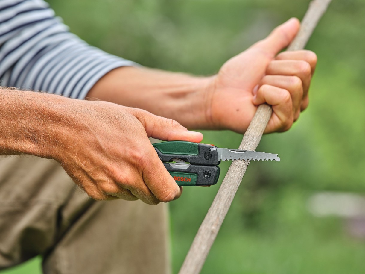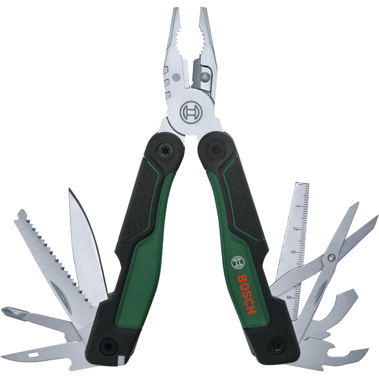 Многофункциональный инструмент Bosch 16 в 1 - незаменимый помощник в мастерской, на кухне или на природе. Он содержит несколько отверток, плоскогубцы, бокорезы, пилу, нож, ножницы, напильник, шило с петлей для резьбы, открывалку для бутылок и банок, зубочистку, пинцет и метрическую линейку, что делает его идеальным для выполнения домашних задач и кемпинга.
