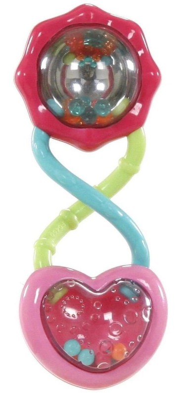 У погремушки от Bright Starts два прозрачных отсека с разноцветными шариками, которые соединены между собой двумя проволочками. В одной емкости находятся прозрачные шарики, которые издают веселые, звонкие звуки и отражаются в зеркальном фоне.