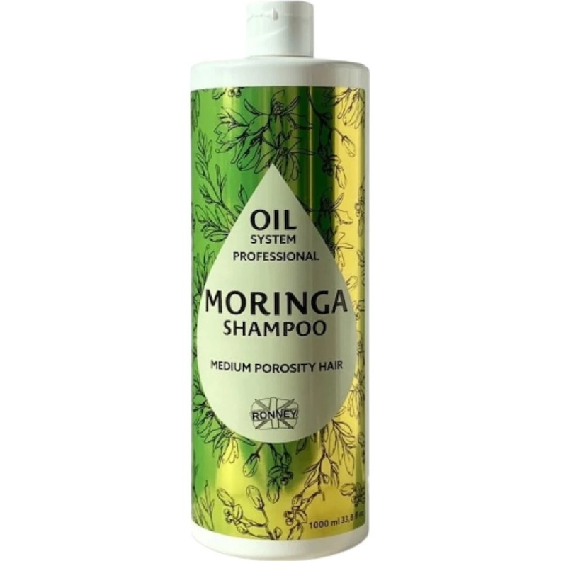 Ronney Oil System Moringa Shampoo 1L — питательный и восстанавливающий шампунь с масляной системой и экстрактом морины, предназначенный для сухих, повреждённых и ломких волос.