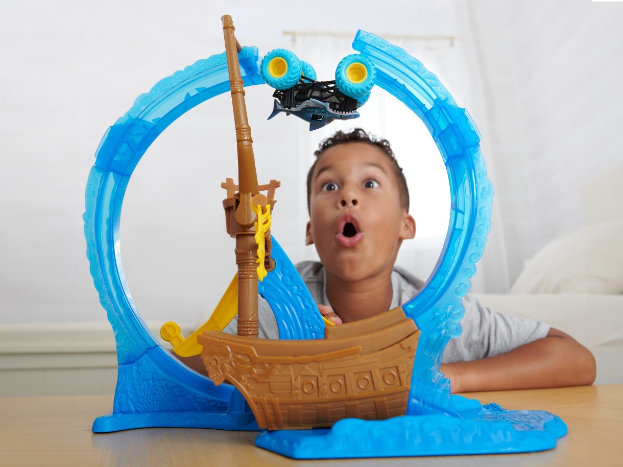ЗАВЕРШИТЕ ПЕТЛЮ РОКА: Отправьте свой литой грузовик Megalodon парить через захватывающую петлю приливной волны. Наблюдайте, как ваш монстр-трак бросает вызов гравитации, перепрыгивает через препятствия и достигает флага!
