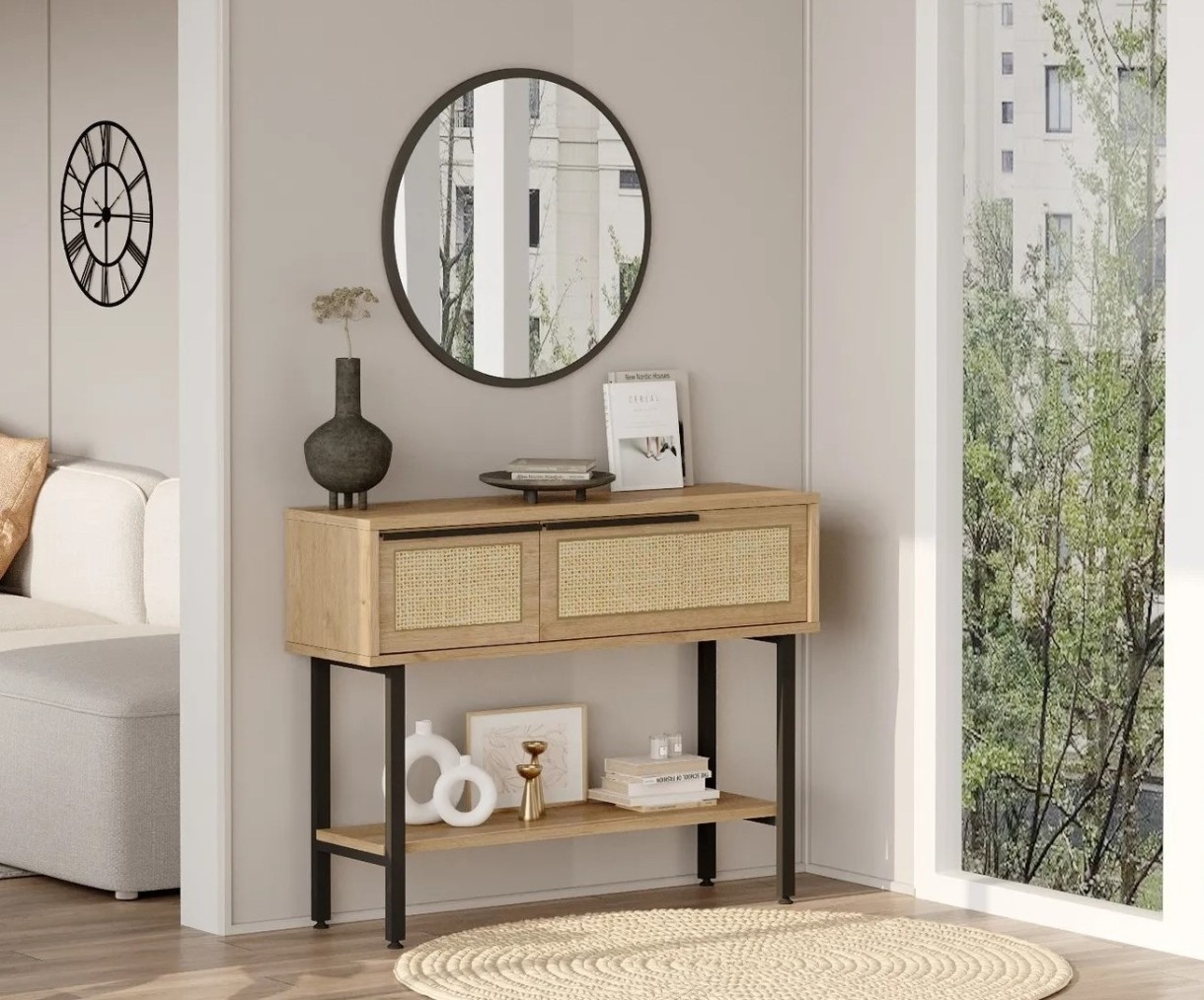 С размерами 100 см в ширину, 76 см в высоту и 29,5 см в глубину, консольный столик предлагает достаточно места для организации и хранения вещей. Встроенное зеркало добавляет функциональность и эстетическую привлекательность, создавая дополнительный элемент стиля.