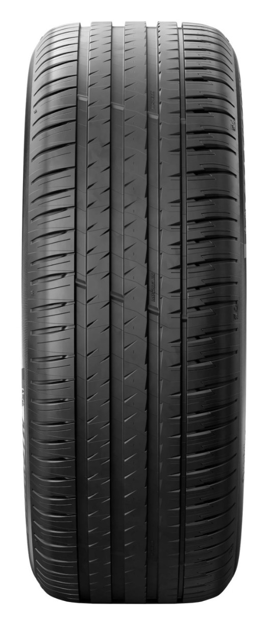 Несимметричный протекторный рисунок примечателен гипертрофированными плечевыми зонами, которые содержат массивные и устойчивые к деформации блоки. Такое решение улучшает сцепление в поворотах, обеспечивая точность управления. Сплошные продольные ребра в центральной части усиливают эти свойства при прямолинейном движении, уменьшая сопротивление качению и препятствуя быстрому истиранию протектора. Исключительно широкие канавки позволяют сохранить надежность управления на мокром покрытии.