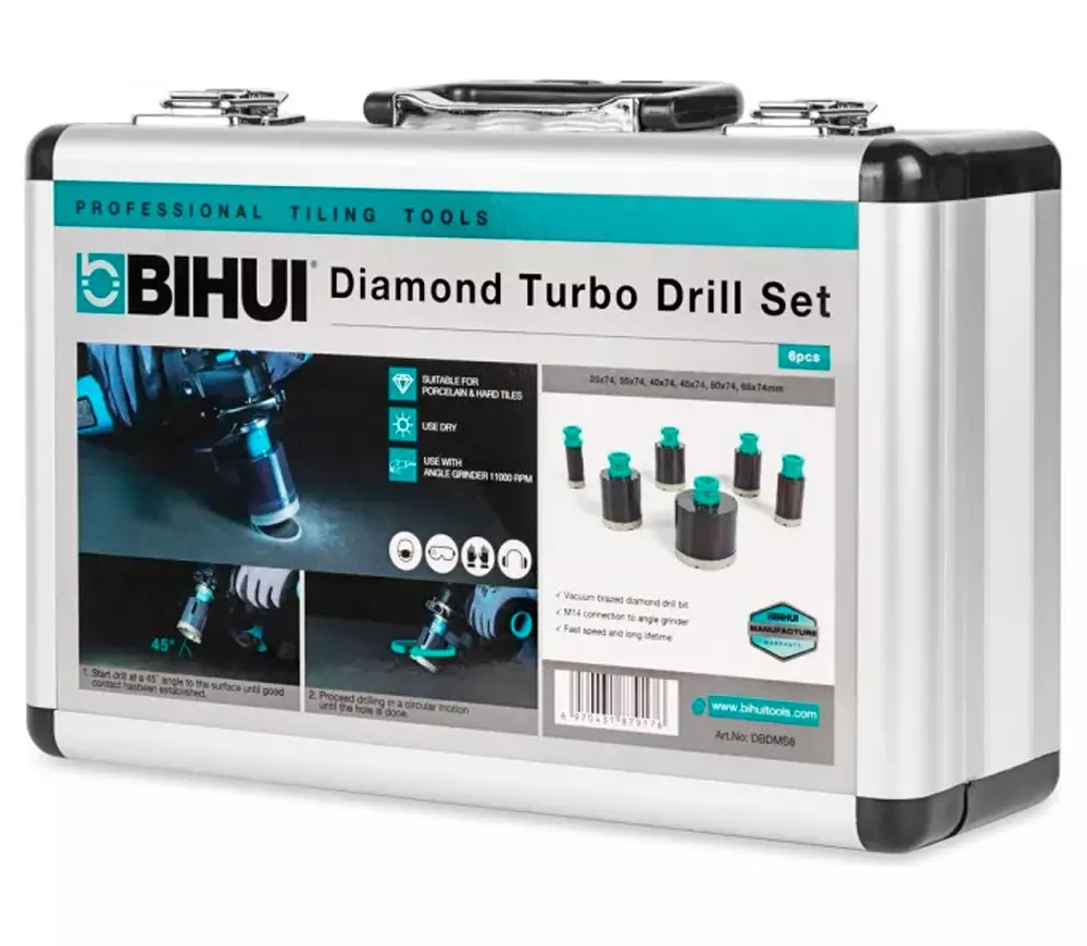 Алмазные коронки BIHUI Dry Gres рекомендуется для просверливания любого типа керамической плитки, особенно керамогранита, а также других облицовочных материалов, таких как мрамор и гранит.
