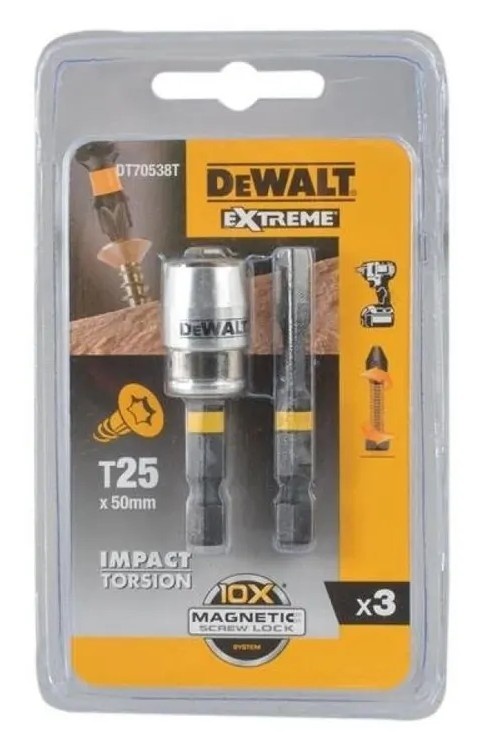 Биты Т25, 57 мм, 2 шт + держатель MAGNETIC SCREW LOCK DEWALT DT70538T обеспечивают высокую надежность работы при сверлении с ударом. Держатель имеет подвижные магнитные кольца с 10-кратным усилием фиксации.