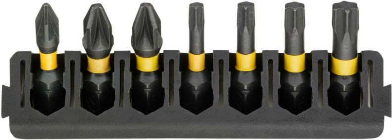 Набор бит DeWALT FlexTorq DT70813-QZ включает 7 бит длиной 25 мм с шлицами Pozidriv (Pz1, Pz2) и Torx (T15, T20, T25, T30), предназначенных для работы с шуруповертами, включая ударные (импакты). Биты изготовлены из высококачественной стали методом фрезерования, что обеспечивает высокую прочность, точность и долговечность. Технология FlexTorq создает торсионную зону, которая снижает нагрузку на биту, минимизирует скольжение (кам-аут) и увеличивает срок службы при высоких крутящих моментах.