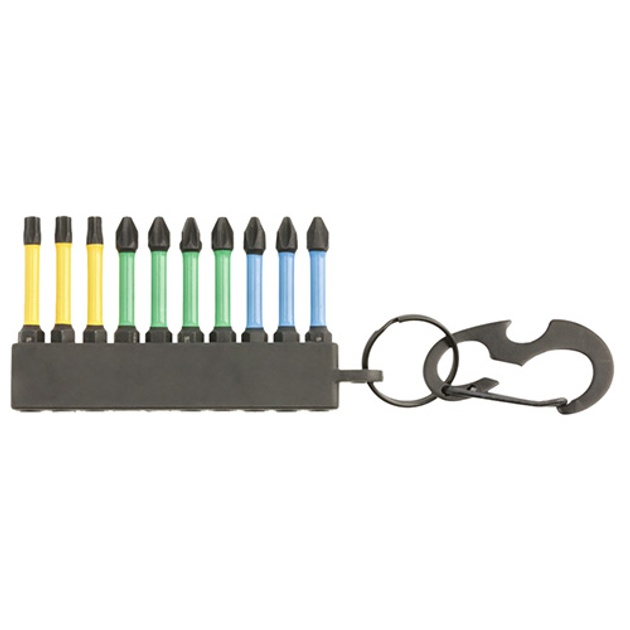 Набор бит ударных Hoegert HT1S699 PH/TORX/PZ - Набор из 10 бит, предназначенных для использования с ударными шуруповертами и дрелями с патроном 1/4". Для выполнения тяжелых работ они изготовлены из высококачественной закаленной легированной стали S2. Состав металла, из которого изготовлены биты, делает их более устойчивыми к скручиванию при передаче усилия на винт, а значит, они могут работать с большими крутящими моментами. Технология термической и механической обработки рабочей части делает инструменты достаточно гибкими для поглощения ударов. Намагниченный наконечник облегчает работу с шурупами. Практичная упаковка с дополнительным крючком (карабином) позволяет легко хранить и носить биты с собой.