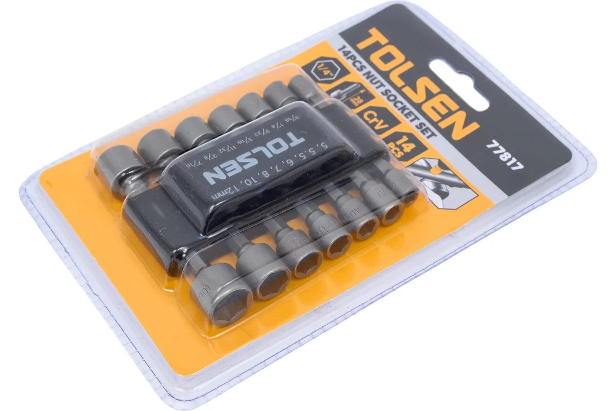 Набор TOLSEN 77817 предназначен для работы с различным крепежом и отлично подходит для использования с шуруповёртами, ручными отвёртками с держателем 1/4" и другими инструментами с шестигранным хвостовиком.