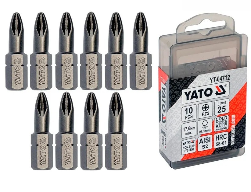 Набор бит YATO YT-04712 РZ2 x 25 мм 10шт - Бита выступает в качестве съемной оснастки во время работы с саморезами, шурупами и винтами. Оптимальная геометрия дает возможность обеспечить высочайшую эффективность при завинчивании или отвинчивании. Биты кованные, изготовлены по технологии NON-SLIP SYSTEM, с возможностью скольжения наконечника в гнезде винта, что гарантирует длительный срок эксплуатации. Прецизионные наконечники защищены покрытием от коррозии. Данные биты относятся к типу крестовых с шестигранным хвостовиком.