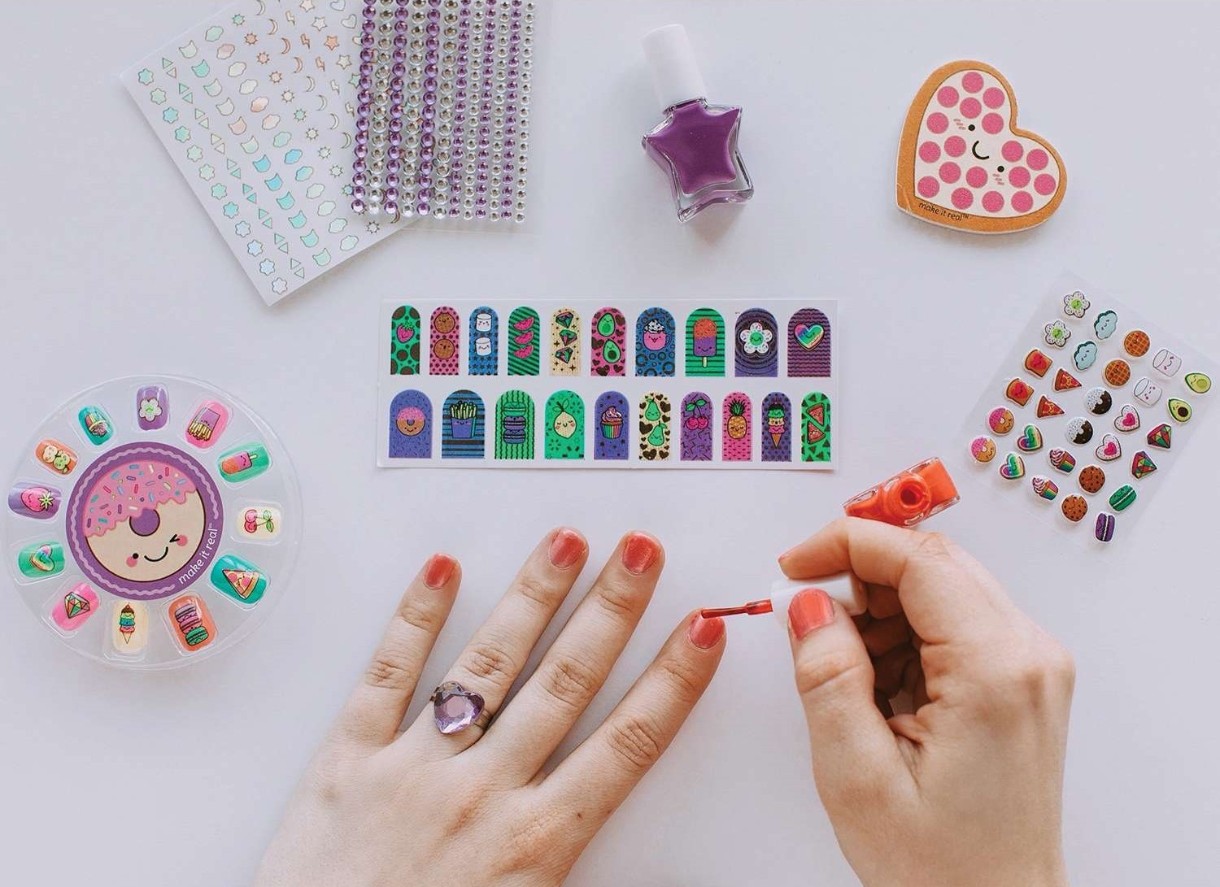 Дополнительно в комплектенакладные ногти, 2 цвета лака, 2 листа наклеек, пилочка для ногтей, пластиковое кольцо