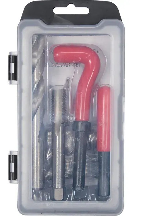Предназначен для замены испорченной резьбы на новую. Элементы набора изготовлены из крепкой нержавеющей стали.