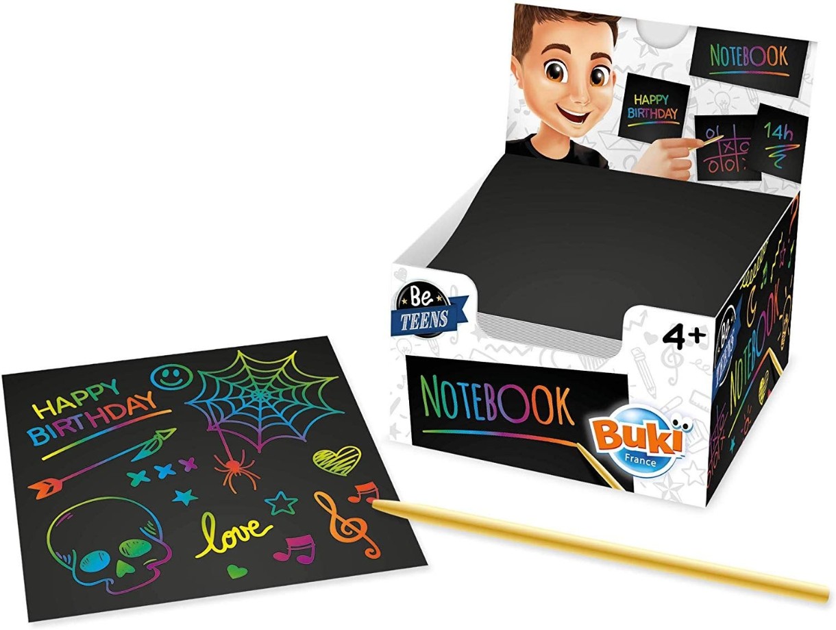 Помните те черные листы бумаги, на которых начинают проявляться цвета, когда вы рисуете деревянной ручкой? Альбом для рисования — отличное развлечение для детей и взрослых, он делает наши рисунки более красочными и веселыми. Именно поэтому французская компания Buki выпустила набор из 150 скретч-карт! Все они хранятся в удобной картонной коробке, с помощью которой вы можете разместить их на своем столе или всегда носить с собой. Вы можете вести на них свои заметки или просто рисовать.