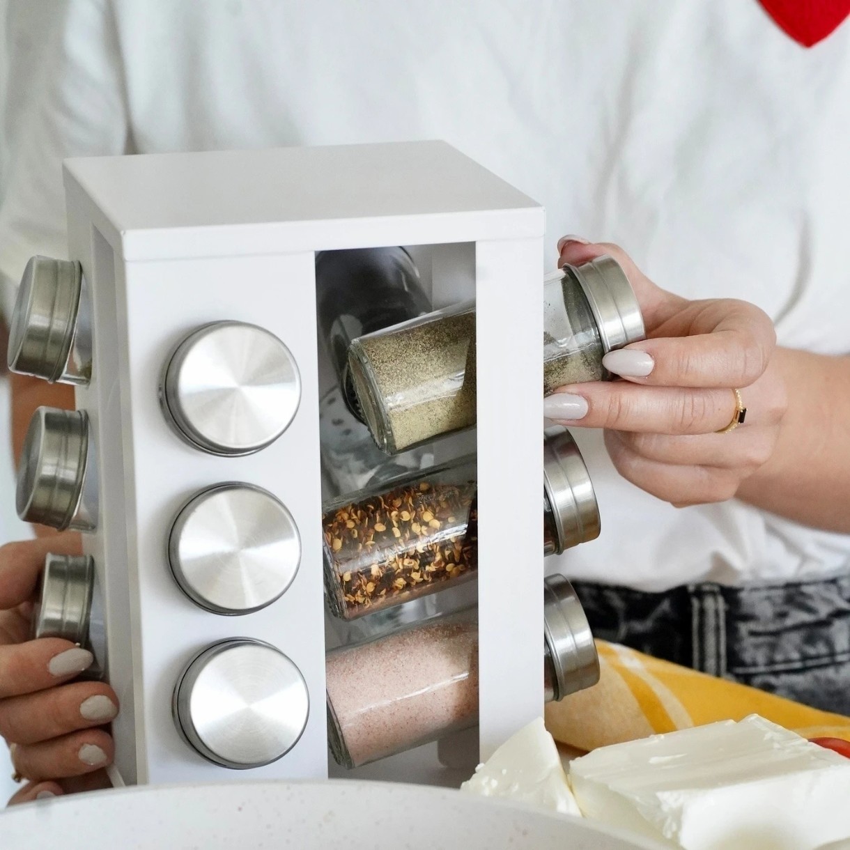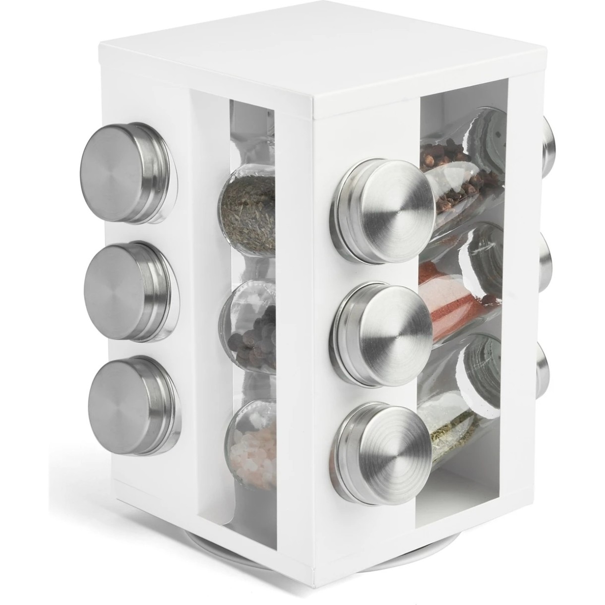 Подставка вмещает до 12 контейнеров для специй, поэтому все они могут быть в одном месте и под рукой. Размеры всего изделия составляют 17x17x22,5 см.