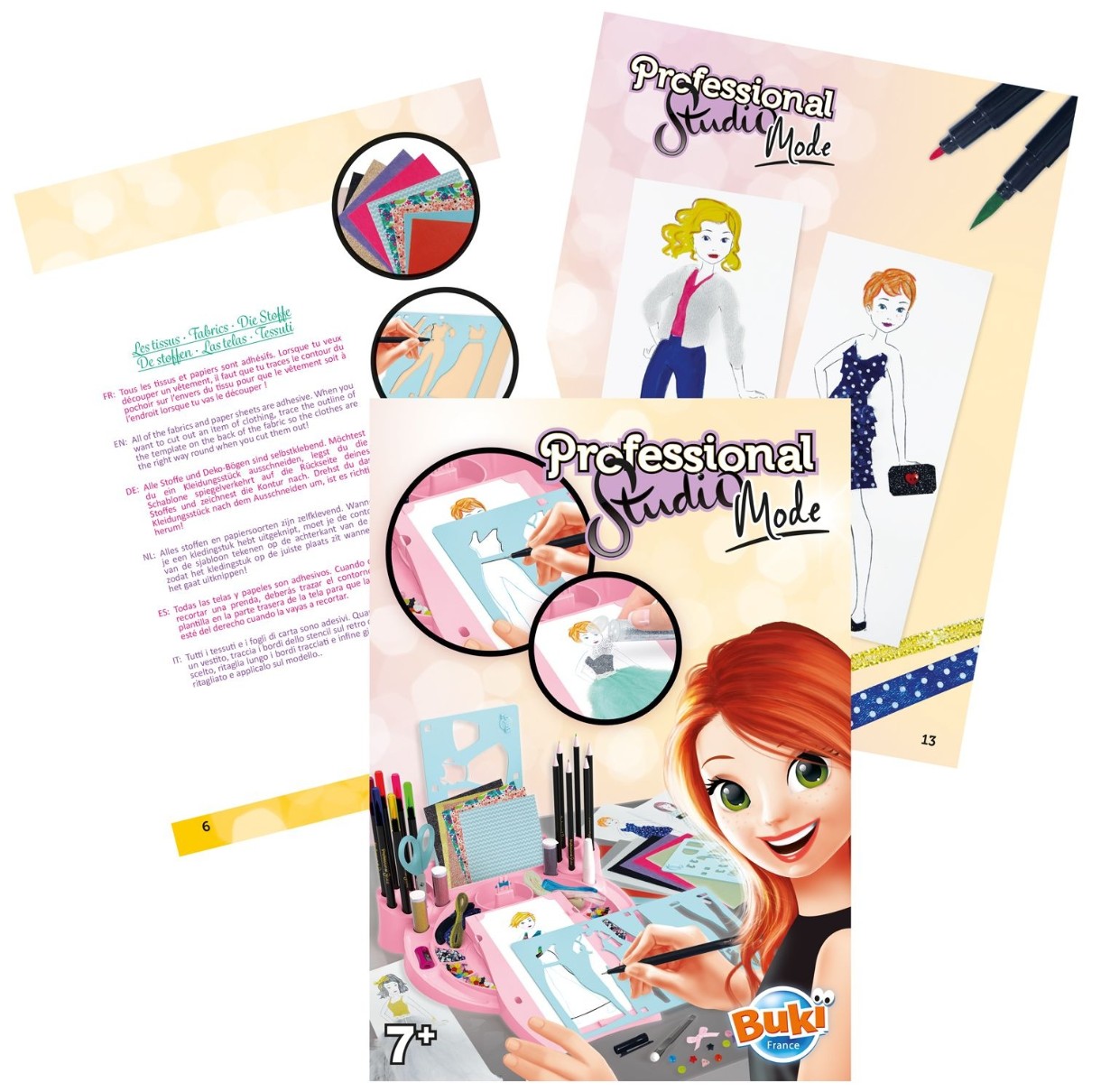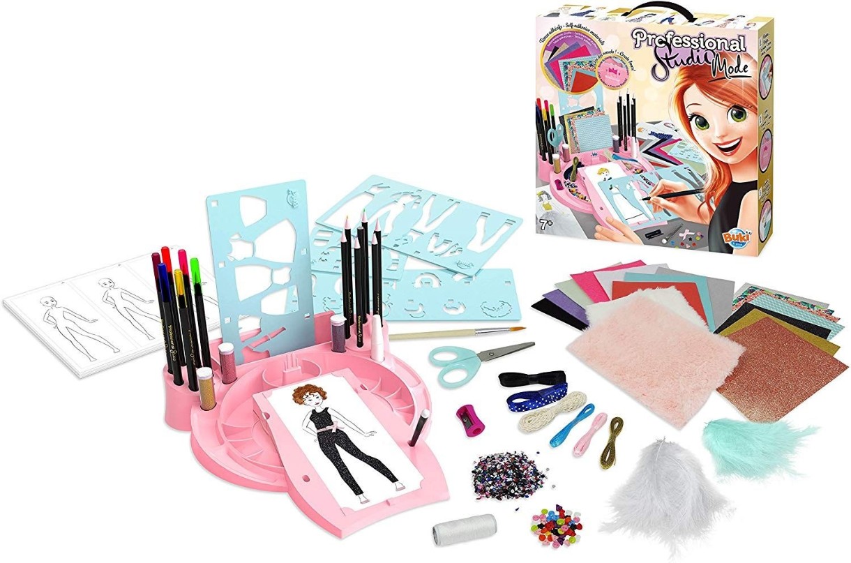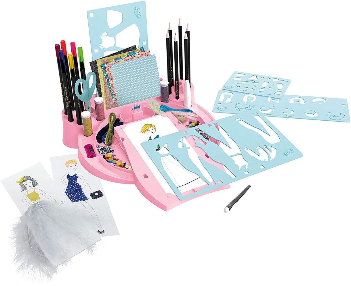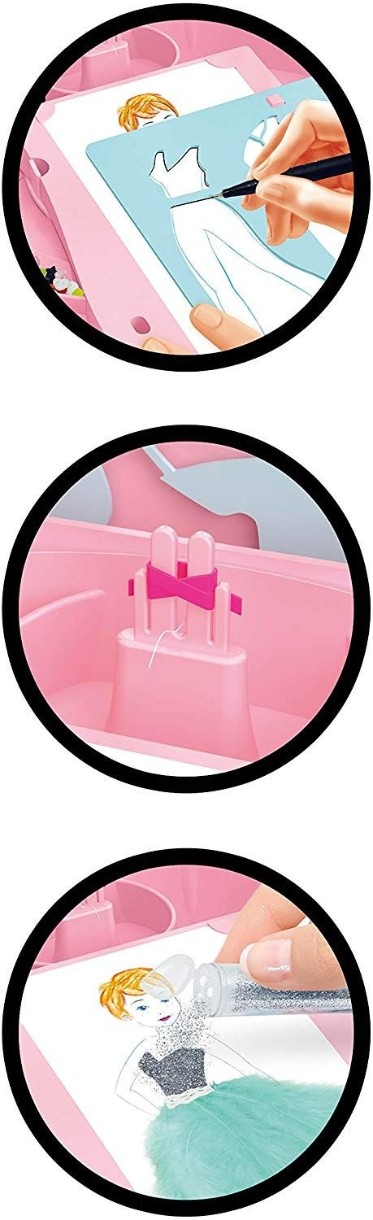 Выберите выкройку, создайте наряды, используя шаблоны, а затем дополните их, используя множество различных аксессуаров, входящих в комплект: самоклеящуюся ткань, перья, блестки, фетр, ленты, акварельные карандаши, ножницы, точилку для карандашей и многое другое.