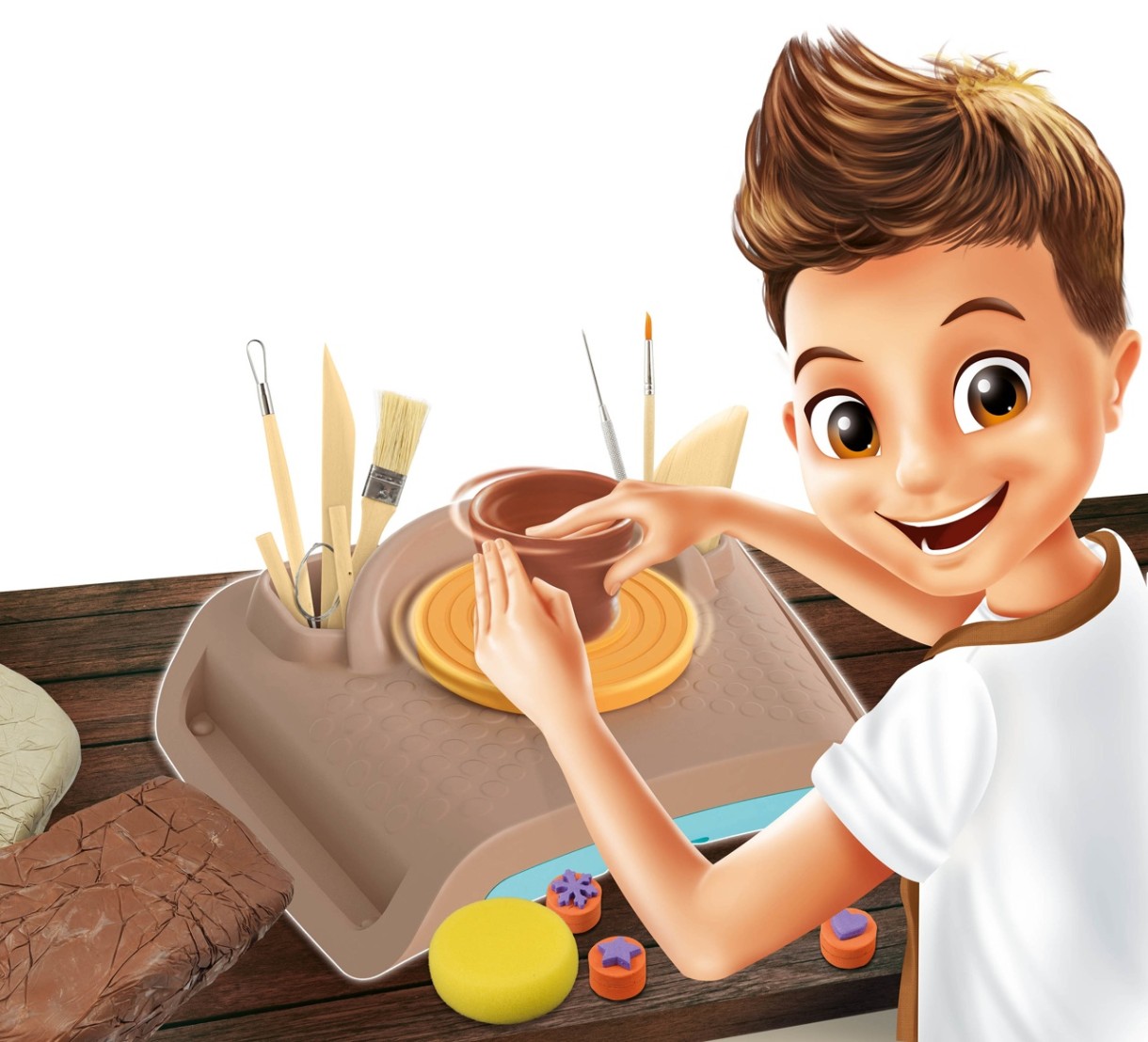 Комплектация1 гончарный круг с ящиком, 1 кг белой глины, 1 кг коричневой глины, 1 палитра, 5 инструментов для лепки из металла или дерева, 5 тюбиков краски по 15 мл, 2 кисти, 5 тюбиков с блестками, 1 стилус, 3 штампа. , 1 губка, стразы, 1 тюбик клея, 1 съемный мотор,