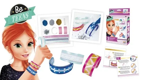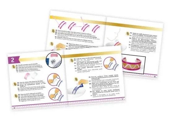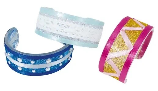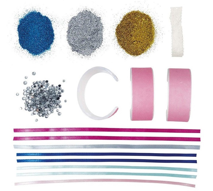 Комплектация3 браслета с клейкими полосками,серебряная парча (3 г), золотая парча (3 г), синяя парча (3 г), ленты, кружево, цирконий (1 г), цветные инструкции